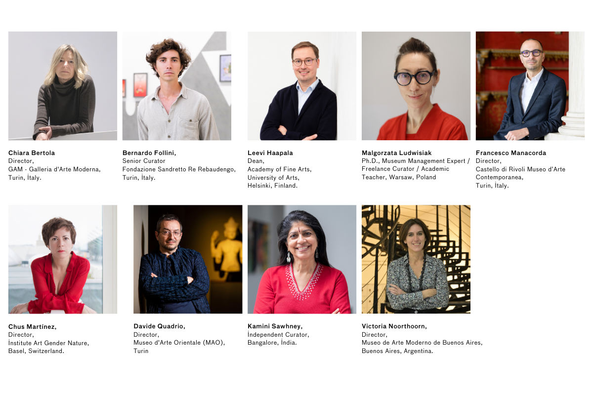 Image: Leevi Haapala, Dean of the Academy of Fine Arts at the University of Arts in Helsinki, Kamini Sawhney, Independent Curator in Bangalore, Davide Quadrio, Director, Museo d'Arte Orientale (MAO), Francesco Manacorda, Director of Castello di Rivoli Museo d'Arte Contemporanea; Chiara Bertola, Director of GAM – Galleria Civica d'Arte Moderna e Contemporanea di Torino, Patrizia Sandretto Re Rebaudengo, President of the Fondazione Sandretto Re Rebaudengo, Suhanya Raffel, President of CIMAM and Director M+ Hong Kong, Chus Martinez, Director of the Institute Art Gender Nature in Basel, Bernardo Follini, Senior Curator at Fondazione Sandretto Re Rebaudengo.