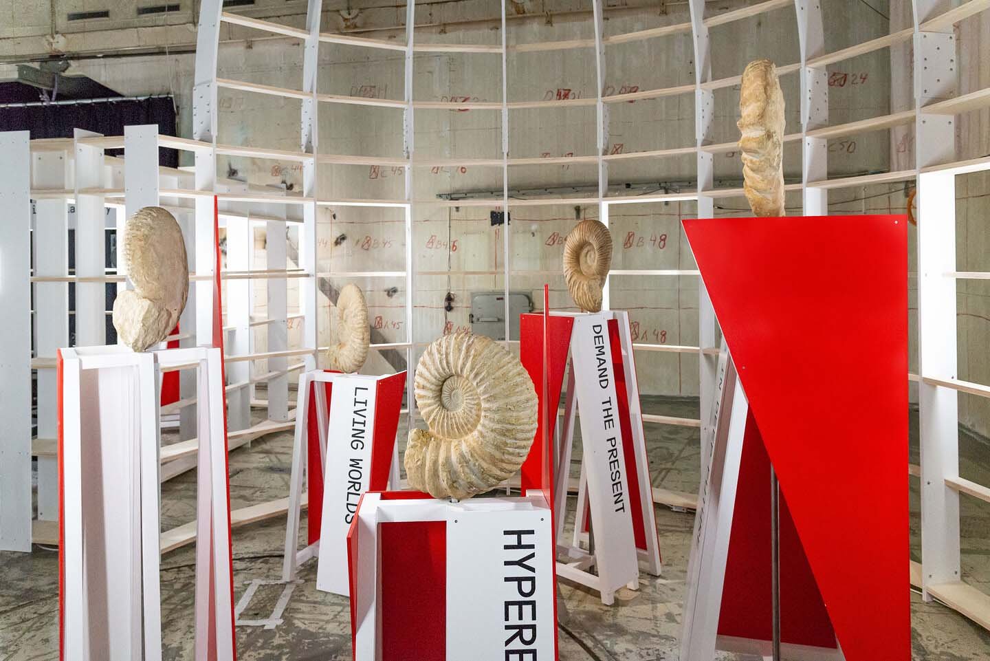 In his installation Neo-Constructivist Ammonites, Staal combined elements from Russian avant-garde propaganda design with the fossilized shells of ammonites, sixty-six to three hundred million years old; once prevalent in the world’s oceans, these mollusks perished in the fifth mass extinction. Today, at a time some are describing as the sixth mass extinction, humans have assumed the main role in the annihilation of species, which are disappearing at a rate a hundred times faster than they would without us. Staal’s ammonites are set on vertical neo-constructivist objects as portraits, if you will, of our nonhuman comrades, as if they were spreading the word from their pedestals about their heroic role in history, about how the ammonites, which are found in various layers of the earth’s crust, help us to understand, recognize, and distinguish different geological eras. The ammonites, then, are our teachers, who tell us how important it is to stand in solidarity with, and be responsible towards, everything that might soon become a fossil.