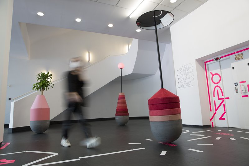 The second experimental stage in the museum’s spatial design is seen as the next step in the ‘demilitarisation’ of transit and relationships based on different protocols to bring about new rituals for enjoying common spaces. Entre (Between) has been designed by Studio Animal as a light and reversible vertical and volumetric expansion that encourages the normalisation of emotions in a situation of pandemic. These ‘roly-polys’ are turned into performative agents owing to their inherent contradictory complexity – they display both a sharp geometry and soft warmth, while exhibiting an instability that is challenged by their slenderness – in a spatial grammar that highlights their anchored nature. Entre manages to casually structure this coexistence by means of a series of structures set on a spherical base that delimit the transit spaces of the museum.