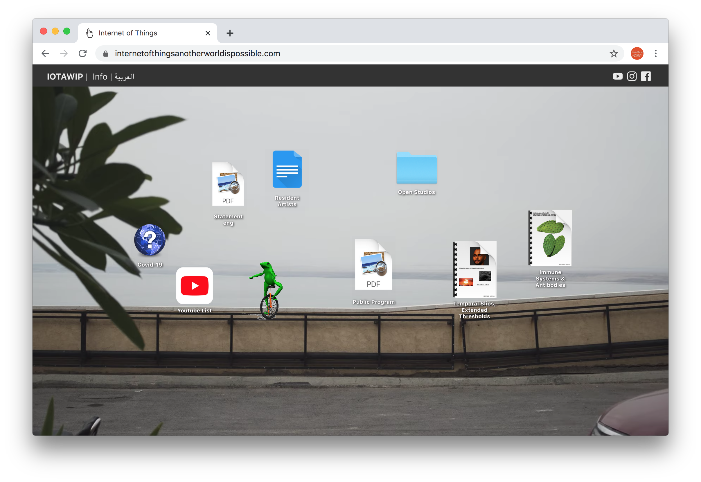 Initiated by Darat al Funun in April 2020, "Internet of Things: Another World is Possible" facilitates a collective inquiry from (and through) the quarantine; navigating online and offline, traversing temporalities. Conceived with the world on lockdown as a result of the COVID-19 and most human interaction relegated to cyberspace, the project inquires into our heightened vulnerability to the reign of communicative capitalism and high technology. It is an invitation for reflecting on the Situ, from our active positions behind the screens, deconstructing the crisis, contingency, social structures, cyberspace, memes, anxiety, technology, geography and body-politics. Live stream to news feed; from the medium and its discontents to the state of emergency.