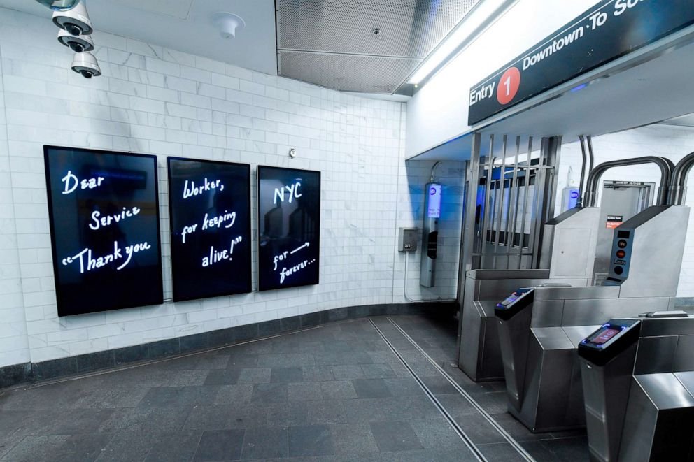 The Queens Museum recently launched a project that is both accessible to the public and fully interacts with today's crises. It consists of black and white works by artist Mierle Laderman Uke, with the words "Dear service worker, 'Thank you for keeping NYC alive!' For ------> forever..." The art is displayed on a digital billboard in Times Square, on the facade of the Queens Museum and in the MTA subway, in the form of posters.