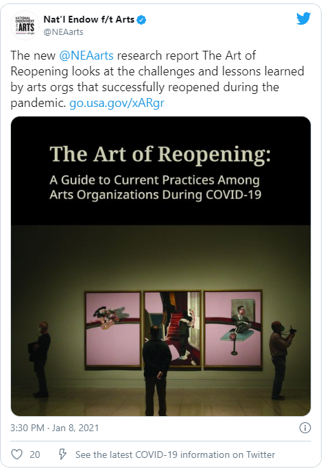 Included in the guide, too, is a survey of the reopening strategies from national service organizations in the arts, such as the American Alliance of Museums and the Association of Art Museum Directors, conducted by the NEA’s office of research and analysis last September and October.