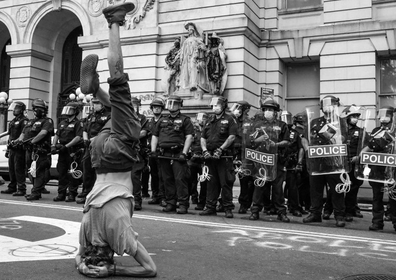 For museums nationwide, documenting COVID-19 has been inseparable from documenting the ongoing Black Lives Matters protests. At the Museum of the City of New York, a social media open call for images of “a socially-distanced NYC” and scenes of activism drew nearly 20,000 images from professional and amateur photographers. Some are now on display in New York Responds, a new outdoor exhibit of photos and stories of pandemic life. One of the photos, taken by street photographer Clay Benskin, captures a protester doing a handstand in front of a line of NYPD officers outside City Hall on the evening of July 1.
