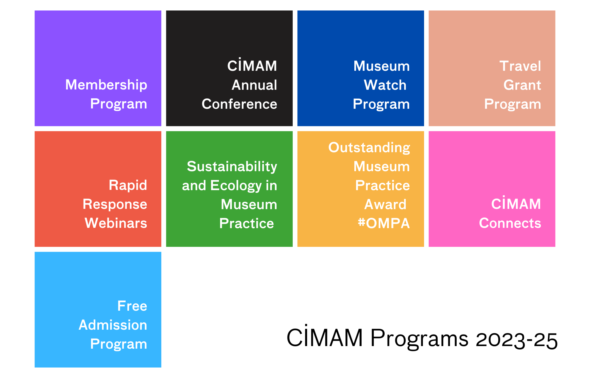 CIMAM envisions a world where the cultural, social, and economic contribution of modern and contemporary art museums, collections, and archives is widely recognized. Its mission is to provide an international forum for debate and knowledge exchange, advocate for best museum practices according to the ICOM and CIMAM Code of Ethics, and support professional development through key programs, including the CIMAM Annual Conference, Rapid Response Webinars, the Museum Watch Program, Sustainability and Ecology in Museum Practice, and the Outstanding Museum Practice Award.